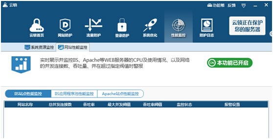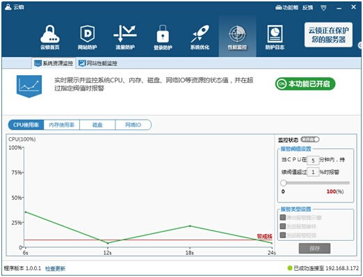 云鎖界面功能導(dǎo)航也沒(méi)啥特別的,界面大同小異,在平日涉及的網(wǎng)站、服務(wù)器安全需求也都囊括進(jìn)去了,操作也符合傳統(tǒng)軟件的使用風(fēng)格,簡(jiǎn)易便捷。首頁(yè)呈現(xiàn)了服務(wù)器的各項(xiàng)狀態(tài),服務(wù)器信息一目了然。 2、網(wǎng)站、服務(wù)器各資源監(jiān)控、可設(shè)定異常預(yù)警線。 云鎖能夠?qū)崿F(xiàn)對(duì)網(wǎng)站性能數(shù)據(jù)的可控可觀,可對(duì)這些數(shù)據(jù)(并發(fā)連接數(shù)、吞吐量等)根據(jù)實(shí)際工作情況在云鎖里設(shè)定一個(gè)“危險(xiǎn)警戒線”,當(dāng)出現(xiàn)異常情況時(shí)會(huì)及時(shí)報(bào)警通知。 ![]()