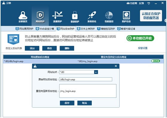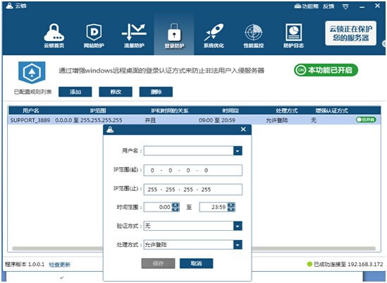 服務(wù)器性能監(jiān)控,系統(tǒng)資源(cpu使用率、內(nèi)存使用率、磁盤、網(wǎng)絡(luò) IO)監(jiān)控圖形化界面展現(xiàn),在圖形中可設(shè)定“危險(xiǎn)警戒線”,當(dāng)出現(xiàn)異常情況時(shí),圖形界面一目了然。 ![]() 3、用戶管理賬號(hào)防護(hù) 云鎖可雙向保障賬號(hào)安全,一個(gè)是可以自定義后臺(tái)地址,相當(dāng)于隱藏了網(wǎng)站后臺(tái)地址,防暴力猜測(cè)網(wǎng)站后臺(tái);另一個(gè)是服務(wù)器賬號(hào)登錄防護(hù),選擇服務(wù)器管理員賬號(hào),可以限制登錄時(shí)間段、 IP及IP段,保障非工作時(shí)間賬號(hào)安全,防黑客入侵服務(wù)器。