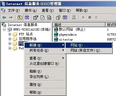 如果使用php的虛擬主機,在網站管理的時候需要用到phpmyadmin在線管理數據庫的工具,下面就看下億恩科技的虛擬主機如果通過phpmyadmin管理mysql數據庫: 下載地址:phpMyAdmin-3.4.3.1-all-languages.zip http://www.phpmyadmin.net/home_page/downloads.php 1、安裝phpmyadmin 將壓縮文件解壓到C:\phpmyadmin然后編輯libraries/config.default.php查找以下每一行,并將這行后邊的值更改和如下代碼所示: $cfg['Servers'][$i]['auth_type'] = 'cookie'; $cfg['blowfish_secret'] = 'enkj.com' $cfg['Servers'][$i]['pmadb'] = 'phpmyadmin'; $cfg['Servers'][$i]['bookmarktable'] = 'pma_bookmark'; $cfg['Servers'][$i]['relation'] = 'pma_relation'; $cfg['Servers'][$i]['table_info'] = 'pma_table_info'; $cfg['Servers'][$i]['table_coords'] = 'pma_table_coords'; $cfg['Servers'][$i]['pdf_pages'] = 'pma_pdf_pages'; $cfg['Servers'][$i]['column_info'] = 'pma_column_info'; $cfg['Servers'][$i]['history'] = 'pma_history'; $cfg['Servers'][$i]['designer_coords'] = 'pma_designer_coords'; $cfg['Servers'][$i]['tracking'] = 'pma_tracking'; 導入phpmyadmin的數據庫文件。 1、開始-運行-cmd-cd C:\Program Files\MySQL\MySQL Server 5.1\bin (在命令提示符模式下進入mysql安裝目錄的bin目錄,mysql若不在此目錄請根據mysql的實際安裝目錄進行更改) 2、分別執行以下命令: Mysql –uroot –p (注:登錄mysql ,此處會提示輸入密碼,輸入mysql的密碼登錄) Source C:\phpMyAdmin\scripts\create_tables.sql (注、此目錄為phpmyadmin解壓存放的目錄,) 搭建phpmyadmin 網站 打開Internet 信息服務(IIS)管理器,如下圖: