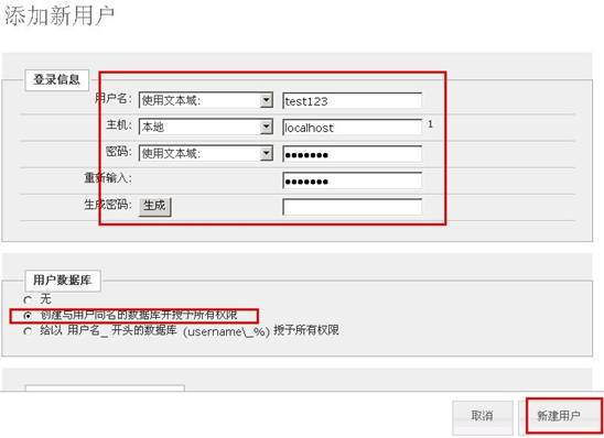 然后點擊添加新用戶 ![]() (創建與用戶同名的數據庫并手語所有權限) 根據如圖所示填上數據庫用戶名、數據庫名、用戶密碼(這是指test123用戶的密碼)、選擇主機,然后選擇【創建與用戶同名的數據庫并授予所有權相】然后點擊新建用戶。 (注:數據庫和空間是在同一臺服務器的話,就使用localhost ,如果是外連的可以使用任意主機。)