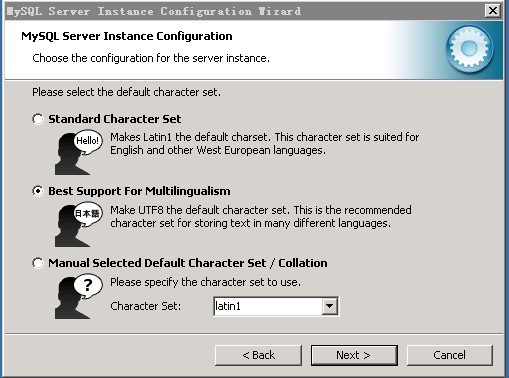 (mysql數據庫默認端口,3306) 按照圖示都勾上,然后next(此處是提示設置端口、添加端口到防火墻、啟用嚴格模式) ![]() 此處可以選擇默認安裝,也可以選擇第二個選項,或者選擇第三個選項之后選擇GB2312,這是設置數據庫的字符集和編碼,國內通常是用GB2312 或utf8