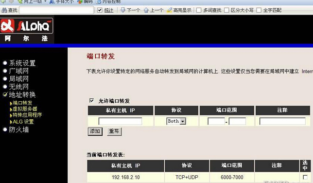 首先進入路由器的設置界面,由于每個路由器的設置界面都不相同,本文以阿爾法路由器為例說明。 找到端口轉發設置選項,一般的路由器都是支持的。