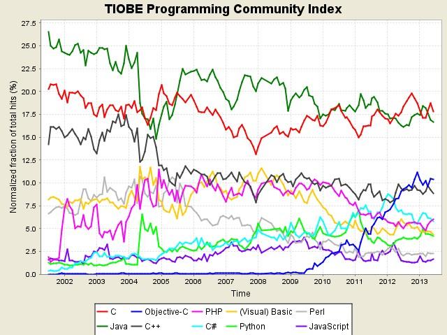 Tiobe公司發布新一期編程語言排行榜。從下面的編程語言排行中,我們不難看出PHP的攀登速度是最為迅速,跟2013年1 月份相比,PHP同比增長了+1.64%,其次就是數據庫語言的Transact-SQL(+0.99%)和PL / SQL(+0.34%)。 Tiobe公司認為,PHP上升的背后主要是來自于2012年9月發布最新的PHP Zend Framework。