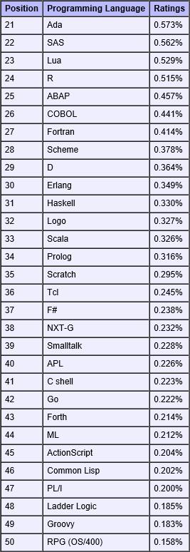 (Visual) FoxPro, 4th Dimension/4D, ABC, Algol, Alice, ATLAS, Awk, bc, BlitzMax, CFML, cg, CL (OS/400), Clean, Clojure, Curl, Dart, DiBOL, Eiffel, Emacs Lisp, Factor, Icon, Inform, Io, J, JavaFX Script, JScript.NET, LabVIEW, LPC, M4, Mercury, MUMPS, NATURAL, Oberon, OCaml, OpenCL, Oz, Pike, PILOT, PostScript, Pure Data, Q, REALbasic, REXX, S, Squirrel, Standard ML, VBScript, VHDL, X10, xBase