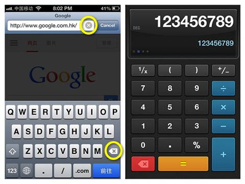 我們?cè)賮砜纯?iOS 中的“刪除”設(shè)計(jì),下圖以 Safari 瀏覽器地址輸入時(shí)界面為例(其他搜索界面類似),兩個(gè)按鈕分別標(biāo)出(下圖左):
