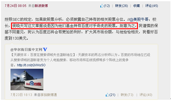 看完我一直不明白候小天為什么這么寫,憑他們的水平應(yīng)該不會(huì)把問(wèn)題看得這么片面扭曲吧,后來(lái)看了微博上@安普若-安校長(zhǎng)的微博,就是上面的截圖,什么都明白了:原來(lái)人家持有奇虎的股份呀,怪不得要絞盡腦汗來(lái)唱衰百度,可以理解,利益至上嘛。