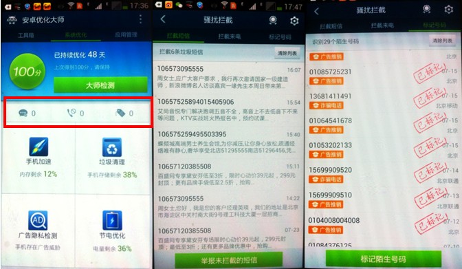 行業專家建議,安裝手機管理軟件能有效杜絕這種現象的發生,如安卓優化大師等市場上的主流手機優化管理軟件,都具備攔截騷擾電話、垃圾短信等功能。相關數據顯示,通過安卓優化大師的精準攔截,手機被騷擾的概率能有效降低91%。