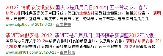 第四和第五是兩個獨(dú)立網(wǎng)站,所以出于筆者的愛好,點(diǎn)進(jìn)去看了下(因?yàn)榍迕鞴?jié)這種放假安排,一般都是大門戶內(nèi)頁或者政府網(wǎng)站公告占據(jù)前排,獨(dú)立網(wǎng)站排名這么好,肯定是有SEO操作的。)