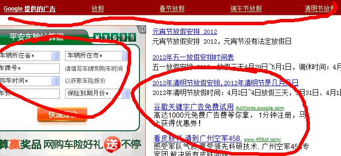 網(wǎng)站第一版大部分是廣告,真正給用戶看的內(nèi)容就是那三條放假安排的文章鏈接。上面是谷歌聯(lián)盟的文字廣告,左邊的百度聯(lián)盟的圖片廣告,右邊是谷歌經(jīng)典 廣告,三個廣告中間夾著的就是用戶搜索的內(nèi)容了。可以看出谷歌文字廣告匹配得非常精確,所以那段廣告肯定也是點(diǎn)擊率最高的,谷歌經(jīng)典點(diǎn)擊率第二,百度圖片 第三,另外網(wǎng)站還有兩次彈窗。