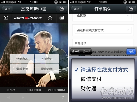 目前,最典型的獲得微信支付接口且搭建了微信店鋪的服裝品牌商是杰克瓊斯,用戶不僅可以在其微信店鋪內選購商品,利用微信支付或財付通支付,還可以在線下選購衣服,然后通過掃碼到線上下單。