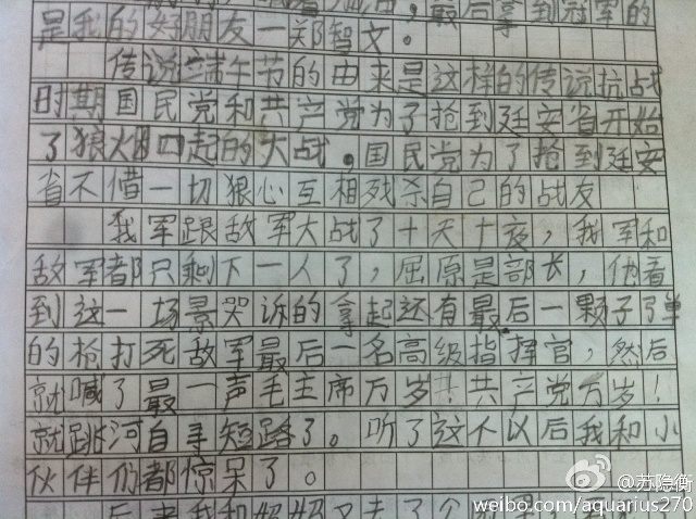 出處:2013年6月,一段講述端午節(jié)由來的小學(xué)作文內(nèi)容截圖在微博網(wǎng)友中熱傳。這篇文章,最早由新浪微博網(wǎng)友“蘇隱衡”發(fā)表于2011年11月14日。援引其中的一句話“我和小伙伴們都驚呆了”被作為網(wǎng)絡(luò)流行語迅速傳播,短時(shí)間內(nèi)成為了熱門話題。