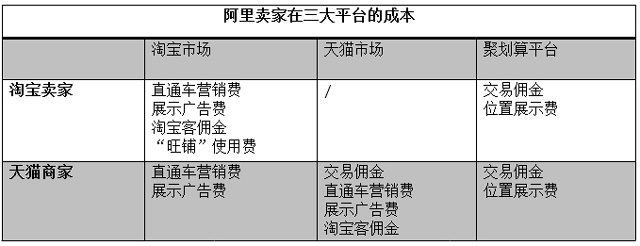 C2C業(yè)務(wù),即淘寶,收入主要來(lái)自于賣(mài)家的營(yíng)銷(xiāo)費(fèi)用;B2C業(yè)務(wù)中,天貓主要靠交易額傭金收錢(qián),而聚劃算的收入主要來(lái)自賣(mài)家的展示廣告位置費(fèi)。下圖中可以清楚的看出,淘寶和天貓賣(mài)家在阿里不同平臺(tái)上做生意,都需要支出哪些成本: