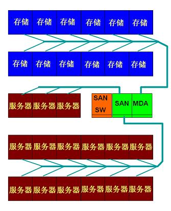 對(duì)高性能服務(wù)器的布線有兩部分組成,一部分上LAN網(wǎng)絡(luò),另一部分下行SAN存儲(chǔ)網(wǎng)絡(luò)。在實(shí)際布線方案的實(shí)施過(guò)程中,筆者有注意到有部分咨詢(xún)方在規(guī)劃布置該SAN 區(qū)域中高性能服務(wù)器,存儲(chǔ)設(shè)備與SAN交換設(shè)備這三者的時(shí)候,采用與機(jī)架式服務(wù)器類(lèi)似的每列以4-8個(gè)設(shè)備柜配置一個(gè)網(wǎng)絡(luò)列頭的方式,這種方式筆者并不推薦,因?yàn)檫@樣會(huì)導(dǎo)致被分開(kāi)擺放于各個(gè)列頭的SAN交換設(shè)備的布線會(huì)變得十分復(fù)雜,各個(gè)放置SAN交換設(shè)備的網(wǎng)絡(luò)列頭間為了實(shí)現(xiàn)上述多點(diǎn)對(duì)多點(diǎn)的連接方式,兩列頭間需要配置大量互連光纖。另外,如果對(duì)于高性能服務(wù)器每列設(shè)置網(wǎng)絡(luò)列頭,也并不利于SAN 網(wǎng)絡(luò)的布線,高性能服務(wù)器一部分光纖上行LAN,一部分下行SAN網(wǎng)絡(luò),如果下行SAN 部分的光纖需要經(jīng)過(guò)網(wǎng)絡(luò)列頭跳接,除了浪費(fèi)布線外,而且也會(huì)導(dǎo)致由于跳接次數(shù)太多,導(dǎo)致整體通道間的光纖損耗太多,當(dāng)前的數(shù)據(jù)中心機(jī)房建設(shè)在SAN 傳輸通道絕大多數(shù)是配置萬(wàn)兆多模光纜,例如萬(wàn)兆多模OM3光纖支持萬(wàn)兆300米的距離下要控制衰減在2.6dB 以下,如果由于整體規(guī)劃的原因使得網(wǎng)絡(luò)配線跳 接太多而導(dǎo)致整體通道過(guò)高的衰減,由于規(guī)劃不合理造成過(guò)高的衰減將是非常的可惜的,即使以預(yù)連接的方案中,也有可能導(dǎo)致衰減過(guò)高,經(jīng)過(guò)計(jì)算,每列設(shè)列頭的 SAN 區(qū)域布線方式,SAN網(wǎng)絡(luò)的整體通道連接 器有可能達(dá)到9個(gè)甚至更多的連接點(diǎn)。鑒于以上的分析,對(duì)于SAN 區(qū)域的布線網(wǎng)絡(luò),筆者更建議采用集中式的配線管理方式,配線區(qū)域放置SAN交換設(shè)備,而服務(wù)器由預(yù)連接光纜直接匯聚到配線區(qū),而不是采用上述傳統(tǒng)的列頭方式,這樣的做法通常每個(gè)通道的連接點(diǎn)可以控制在5個(gè)連接點(diǎn)以下,也更有利于實(shí)現(xiàn)該區(qū)域的配線的管理,節(jié)約用戶(hù)的布線投資,集中式 SAN 配線管理如下圖2所示。由于SAN網(wǎng)絡(luò)配線相對(duì)獨(dú)立,并不一定要將SAN 網(wǎng)絡(luò)的配線區(qū)與LAN的MDA區(qū)域放置在一起,這樣做的好處是除了減少該區(qū)域光纜的平均長(zhǎng)度外,減少布線投資,更重要的是可以減輕LAN 的MDA 配線與線槽路由的壓力,使得配線更清晰,更易管理與維護(hù)及今后的擴(kuò)展。
