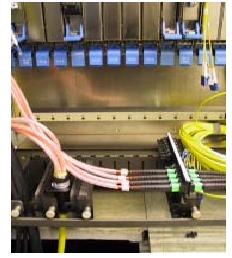 機(jī)柜內(nèi),這類(lèi)布線方式是布線產(chǎn)品根據(jù)各種設(shè)備型號(hào)規(guī)格的不同設(shè)計(jì)各種安裝附件,這些附件可以方便的將這種與設(shè)備配套的布線產(chǎn)品安裝于該設(shè)備內(nèi),這樣EDA可以簡(jiǎn)單地在設(shè)備內(nèi)部集成。這種方式的優(yōu)點(diǎn)是布線便利,擴(kuò)容容易,維護(hù)方便。最大的缺點(diǎn)是由于設(shè)備型號(hào)眾多,根據(jù)設(shè)備的結(jié)構(gòu)需要有許多相應(yīng)的專(zhuān)用配線產(chǎn)品,受限于各廠家設(shè)備內(nèi)部空間結(jié)構(gòu)。典型的機(jī)柜內(nèi)的安裝方式如圖4 所示:
