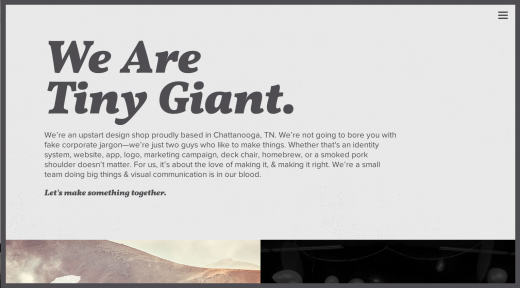 2014年,字體在許多網(wǎng)站設(shè)計(jì)中發(fā)揮重要作用,我未發(fā)現(xiàn)這種趨勢(shì)在短期內(nèi)改變的跡象。可是2015年,我看到網(wǎng)站中的標(biāo)題和字體變得越來越大。夸張地說,就連天上的飛機(jī)可能都能看到地面上的字。當(dāng)你訪問Tiny Giant的網(wǎng)站時(shí),你會(huì)看到很大的字體。這實(shí)際上是一種聲明,讓你很難錯(cuò)過。大字體將繼續(xù)在2015年的網(wǎng)站設(shè)計(jì)中發(fā)揮重要作用,成為確保提高訪客視覺層次的方法。訪客首先會(huì)看到最大的字體,因?yàn)槟菚?huì)首先吸引你的注意力。