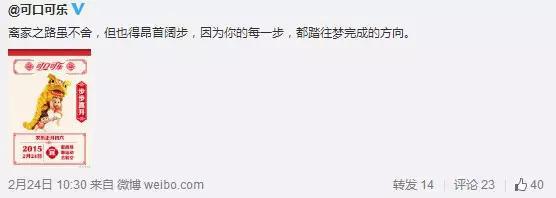 文案上,我更喜歡放假最后一天,也就是大年初六的那條消息,“離家之路雖不舍,但也得昂首闊步,因?yàn)槟愕拿恳徊剑继ね鶋敉瓿傻姆较颉!蔽陌钢档猛扑]。