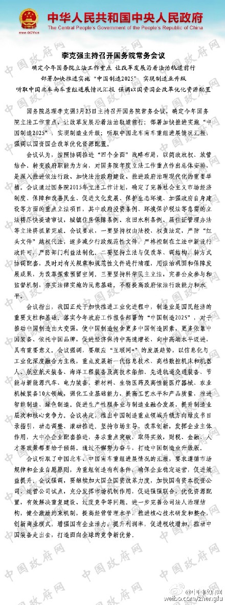 國(guó)務(wù)院總理李克強(qiáng)3月25日主持召開(kāi)國(guó)務(wù)院常務(wù)會(huì)議,確定今年國(guó)務(wù)院立法工作重點(diǎn),讓改革發(fā)展沿著法治軌道前行;部署加快推進(jìn)實(shí)施“中國(guó)制造2025”,實(shí)現(xiàn)制造業(yè)升級(jí);聽(tīng)取中國(guó)北車(chē)南車(chē)重組進(jìn)展情況匯報(bào),強(qiáng)調(diào)以國(guó)資國(guó)企改革優(yōu)化資源配置。