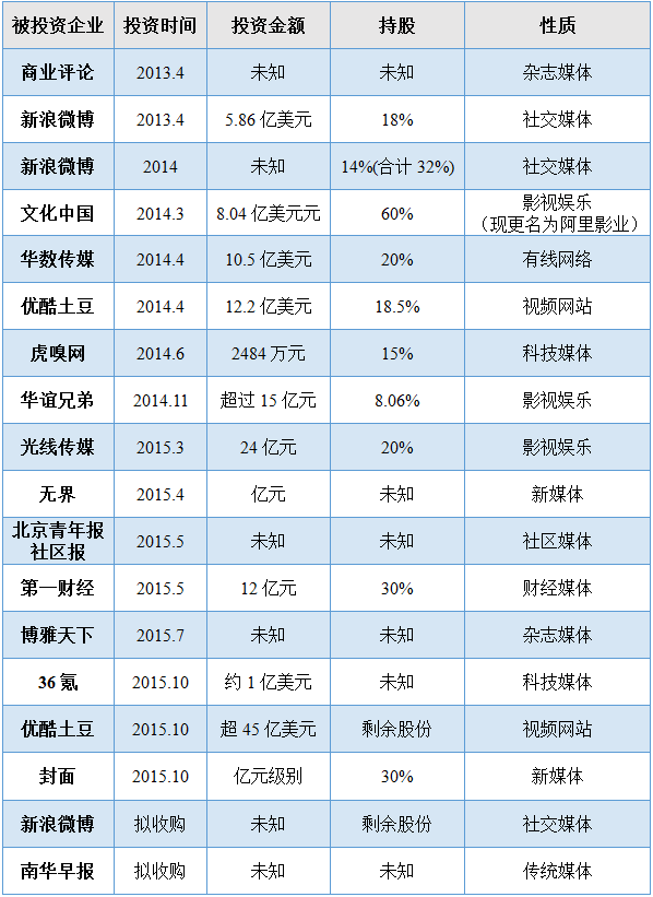 阿里巴巴以電子商務(wù)起家,已經(jīng)吸引了數(shù)以億計(jì)的龐大用戶群,之后進(jìn)入互聯(lián)網(wǎng)金融、泛娛樂(lè)產(chǎn)業(yè)、健康產(chǎn)業(yè)、傳媒產(chǎn)業(yè)等,打造了一個(gè)正反饋的正強(qiáng)化生態(tài)系統(tǒng)。阿里巴巴通過(guò)在傳媒業(yè)的一系列的并購(gòu),已經(jīng)成功在視頻、社交媒體、傳統(tǒng)媒體、電影業(yè)、新聞客戶端等傳媒業(yè)領(lǐng)域布局,傳媒帝國(guó)已然成型,具體見下表。