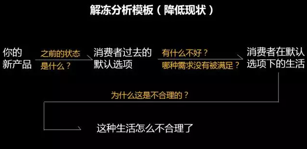此時你需要的,是先“解凍”,讓他們先關注自己(而不是你的產品),意識到自己有一個沒有被實現的目標,而其中一個方式就是——降低他們的現實狀態,讓他們意識到有個“問題”,有“不合理”。