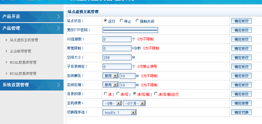 2、通過-管理-進入前臺主機控制面板,管理員可以在這里查看主機信息更改主機狀態父路徑狀態獲取使用空間和對日志進行操作。基本管理功能還包括: 域名綁定、默認文檔、子目錄域名綁定、在線壓縮文件、在線解壓文件、自定義錯誤、修改登錄密碼。高級管理功能包括:ASP.NET版本切換、P訪問限制、執行權限、調試標志、腳本錯誤.。