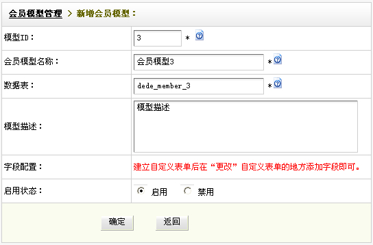 系統默認內置“個人”和“企業”兩個會員模型。我們可以點擊圖二中的[增加會員模型]鏈接進行新建自定義模型。如圖三: