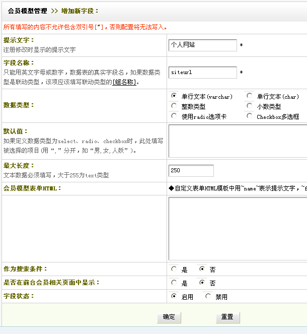 是否在前臺會員相關頁面中顯示:是否顯示該字段;