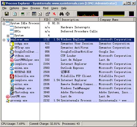 Process Explorer是一款免費的進程監視工具,功能比Windows自帶的任務管理器要強大的多,不僅可以監視、暫停、終止進程,還可以查看進程調用的DLL文件,是預防病毒、查殺木馬的好幫手。