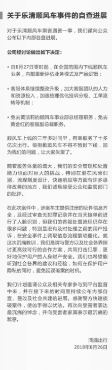 最新消息是,8月27日起,滴滴出行已經開始在全國范圍內下線順風車業(yè)務,重新評估業(yè)務模式和產品邏輯,并免去黃潔莉順風車事業(yè)部總經理職務,免去黃金紅客服副總裁職務。