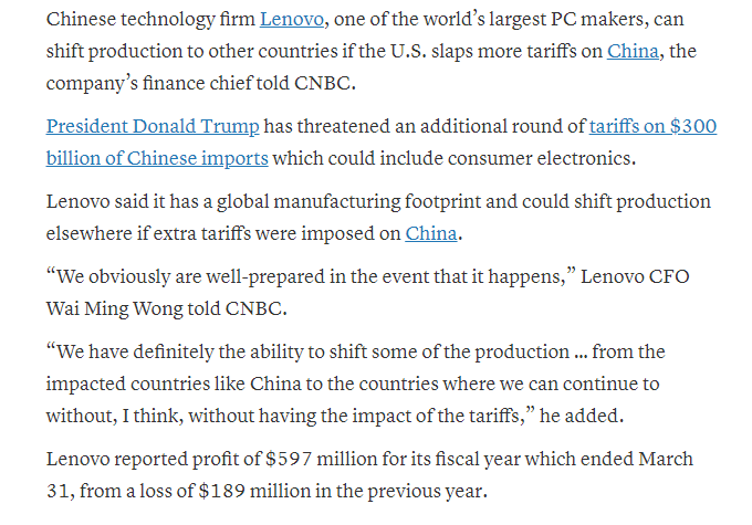 聯想表示,它在全球都擁有制造業務,如果美國對中國征收額外關稅,聯想可能會將生產線轉移到其它地方。聯想CFO24日對CNBC表示,如果美國對中國征收更多關稅,全球最大的個人電腦制造商之一、中國科技公司聯想可以將生產線轉移到其他國家。