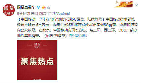 中國移動:今年在40個城市實現5G覆蓋,陸續放號