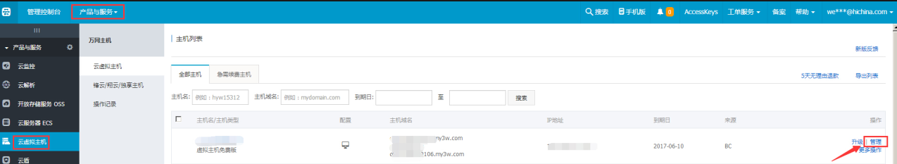 1、登錄云虛擬主機(jī)的管理控制臺(tái),在產(chǎn)品管理中找到云虛擬主機(jī),然后就可以執(zhí)行進(jìn)一步管理。如下圖: