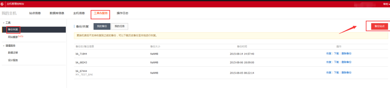 2、在主機(jī)管理控制臺(tái)——>工具和服務(wù)——>備份恢復(fù)——>備份站點(diǎn)——>備份數(shù)據(jù)庫(kù)